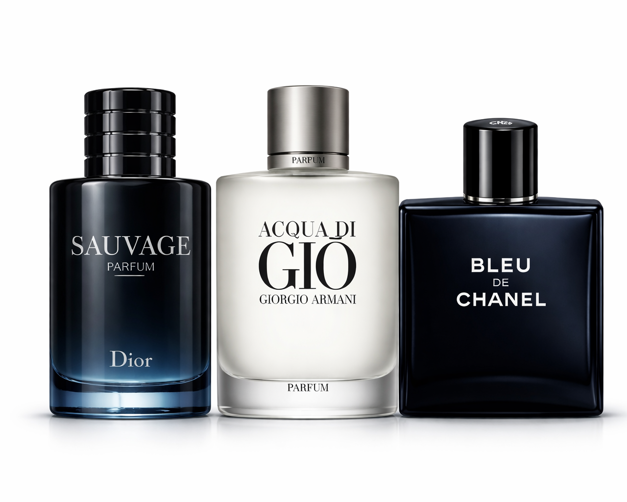 Kit Le Male 125ml + Sauvage Parfum 100ml + Acqua di Giò 100ml – Conjunto com Três Perfumes Masculinos