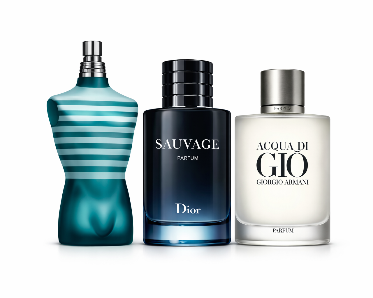 Kit composto por três perfumes masculinos de marcas internacionais: Le Male de Jean Paul Gaultier, Sauvage Parfum de Dior e Acqua di Giò de Giorgio Armani, nas suas versões de maior capacidade.